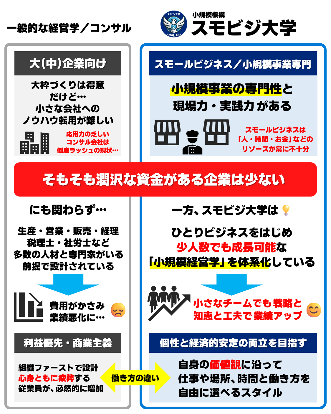 スモビジ大学では、すべてのコンテンツの基礎に小規模経営の哲学があります。