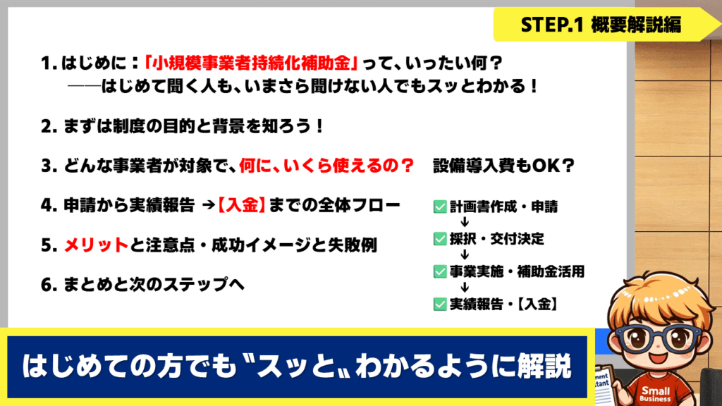 ◉ STEP.1 概要解説編:持続化補助金の全体像をつかもう!│世界一やさしい「小規模事業者持続化補助金」徹底ガイド【スモールビジネスの歩き方】
