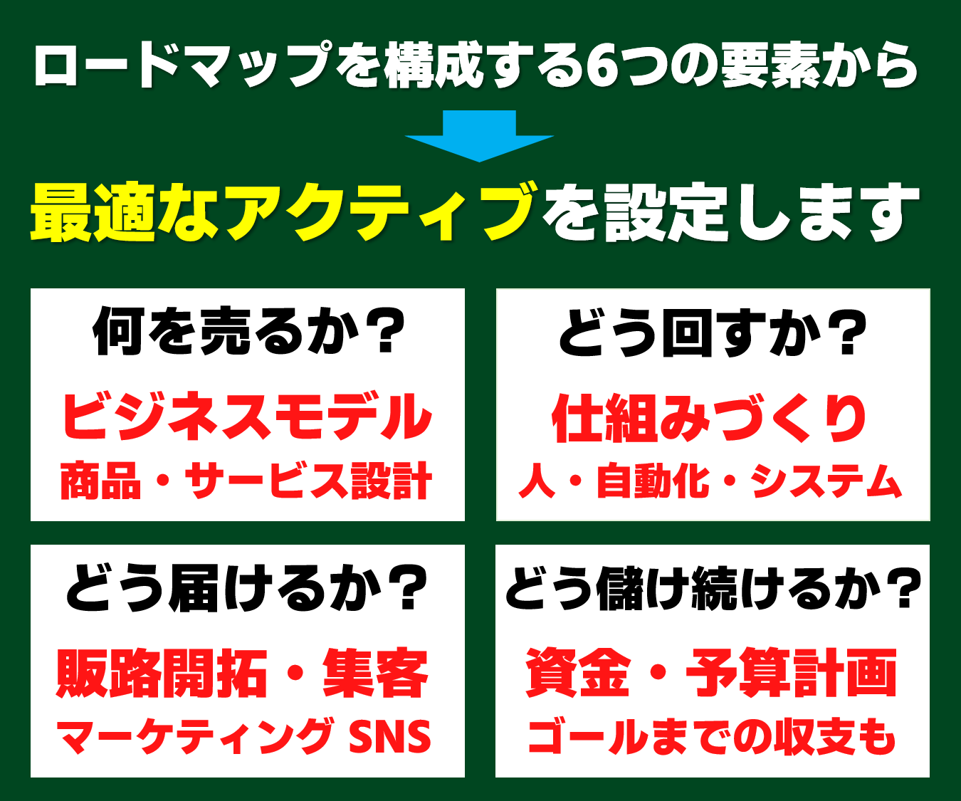 スモールビジネスを「理想の状態」へと導くためには、以下の6つの要素を軸に、どこに立ち、どこへ向かうのかというのを最適な手順で進める必要があります。この設計図こそが偶然の成功を「再現可能な戦略」へと進化させるのです 。