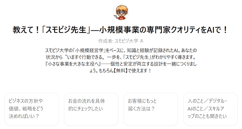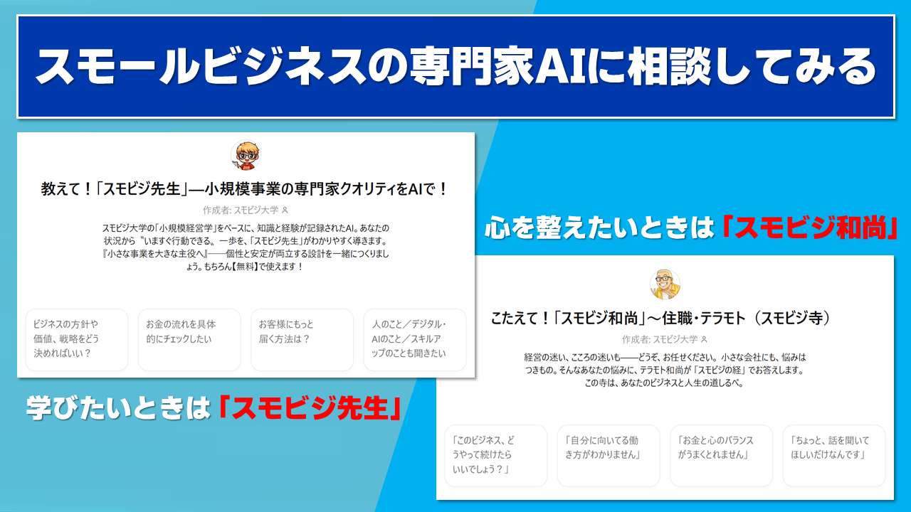 スモールビジネスに特化した、日本発の学問『小規模経営学』をもとにした「AIパートナー」(Chat GPT)をご用意しました。